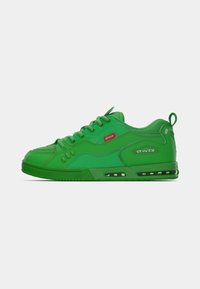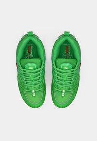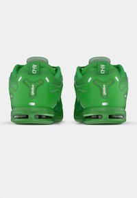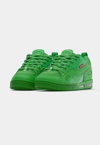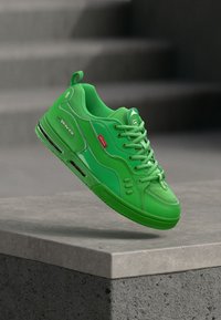 Baskets vert vif avec lacets, étiquette rouge et semelle à coussin d'air, flottant au-dessus d'un coin en béton avec des marches floues en arrière-plan.