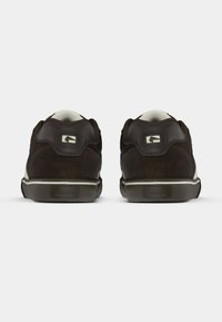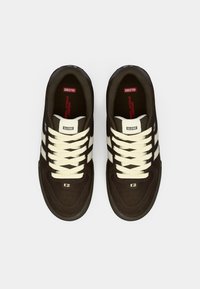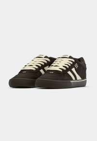 Chaussure de skate marron et beige avec des lacets blancs, une semelle noire et le logo Globe flottant au-dessus d'une surface en béton rose.