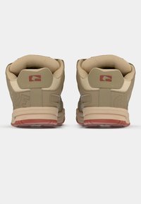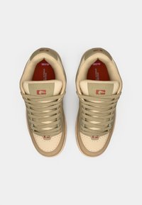 Baskets Globe beige et fauve avec semelle rouge, suspendues en l'air au-dessus d'escaliers en béton gris et du sol, baignées d'une douce lumière solaire.