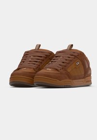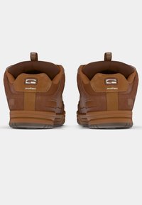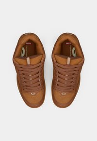 Baskets en daim marron avec lacets assortis, semelle à coussin d'air, et petit logo sur le côté, suspendues au-dessus d'une surface en béton.