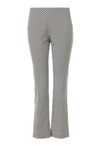 Pantalon à carreaux noir et blanc, coupe ajustée, jambe fuselée, texture lisse, associé à des mocassins noirs.