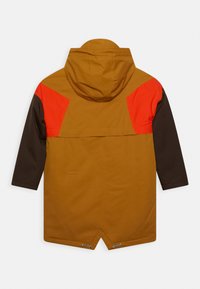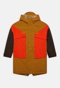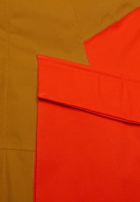 Veste imperméable marron et orange avec capuche, dotée de grandes poches avant et de blocs de couleurs contrastantes sur les épaules et les manches.
