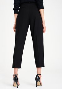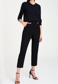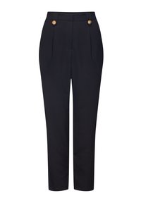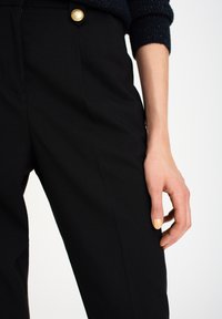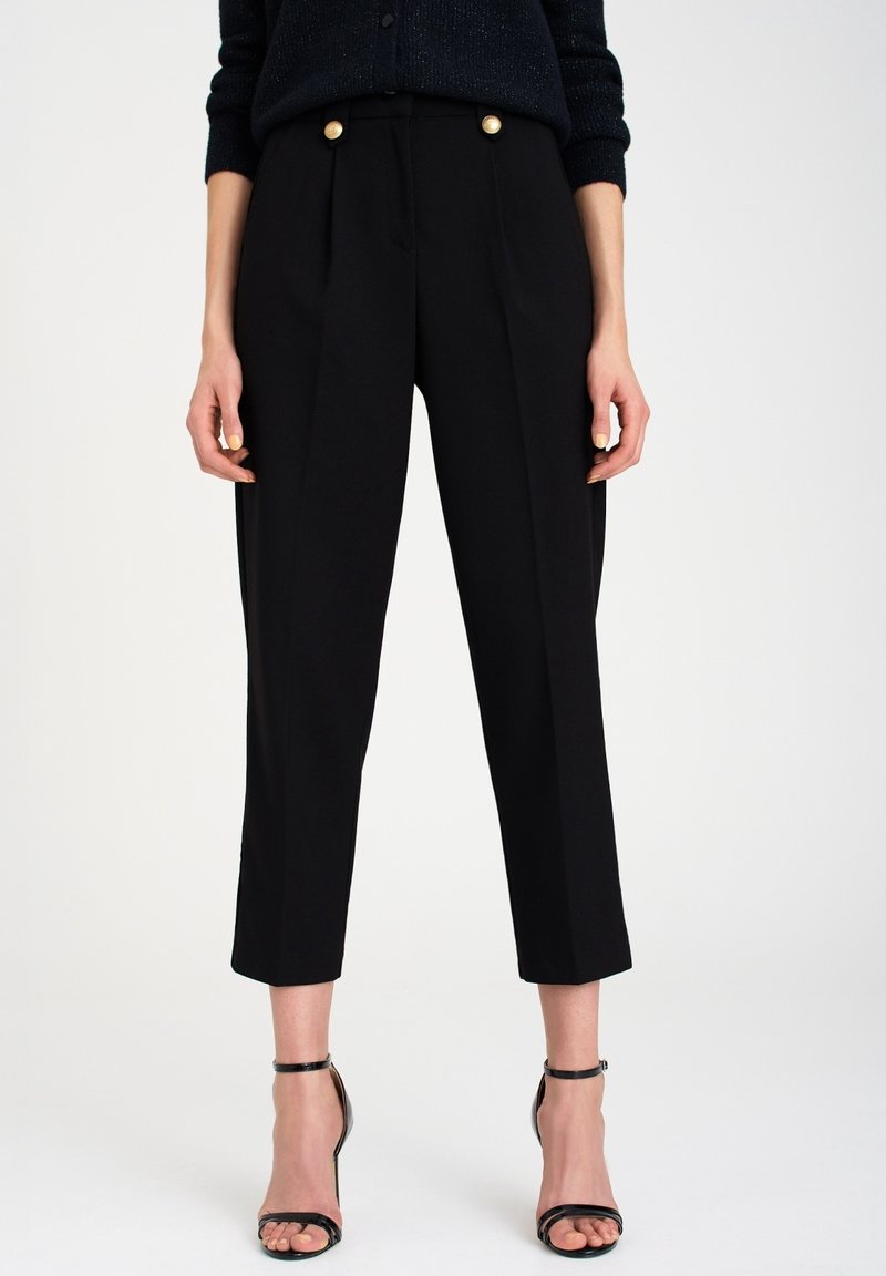 Pantalon noir sur mesure à taille haute, doté de deux boutons dorés à l'avant, avec des jambes fuselées et une texture lisse.