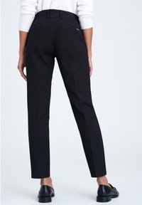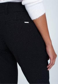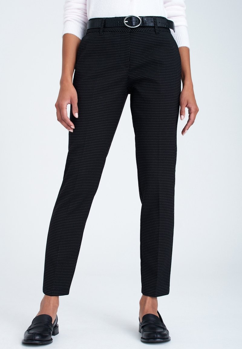 Pantalon noir à motif avec une coupe slim, une texture subtilement ponctuée et une taille ceinturée. Associé à des mocassins noirs.