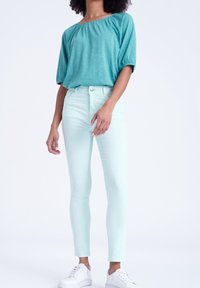 Personne portant un jean skinny bleu clair, un haut à manches courtes bleu sarcelle et des baskets blanches, debout contre un fond uni et clair.