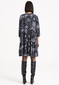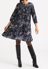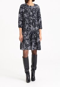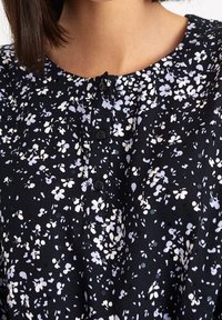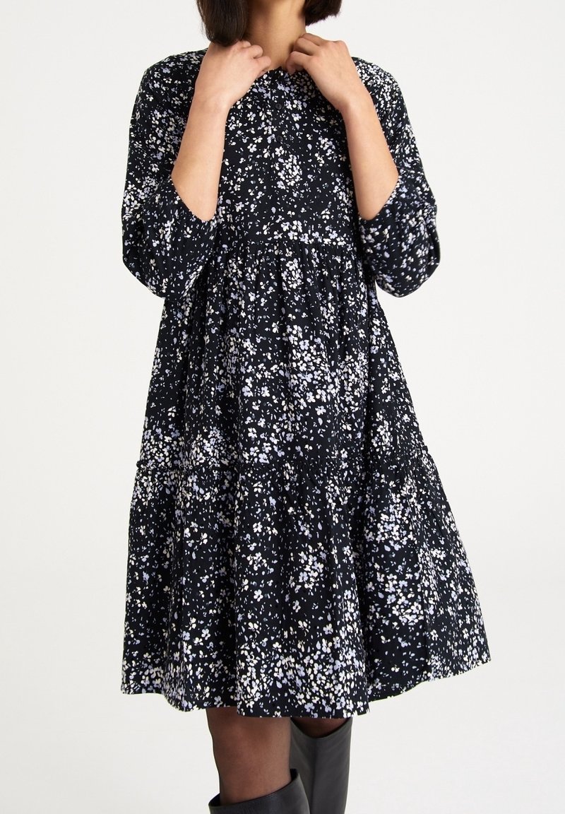 Robe noire à fleurs avec des fleurs blanches et lavande, smockée à la taille, manches longues et jupe à volants. Fabriquée dans un tissu léger.