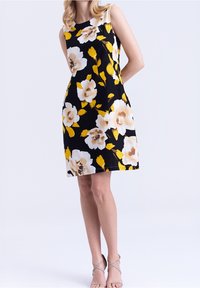 Robe noire sans manches avec un grand imprimé floral blanc et jaune, mannequin avec une main dans la poche et les cheveux blonds lâchés sur l'épaule.