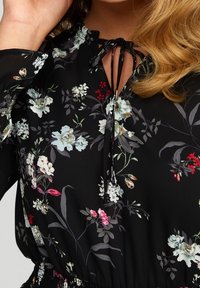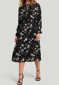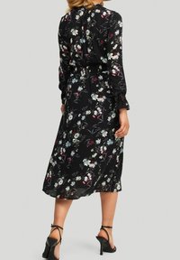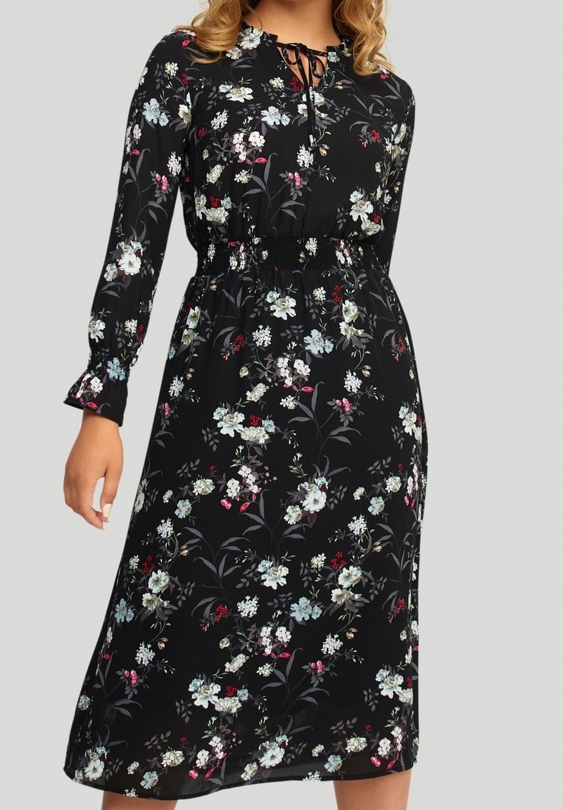 Robe midi noire à manches longues avec imprimé floral blanc et rose, taille élastique et détail noué au niveau du col.