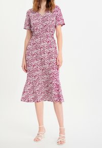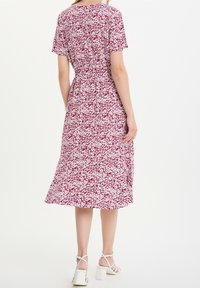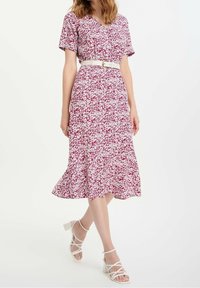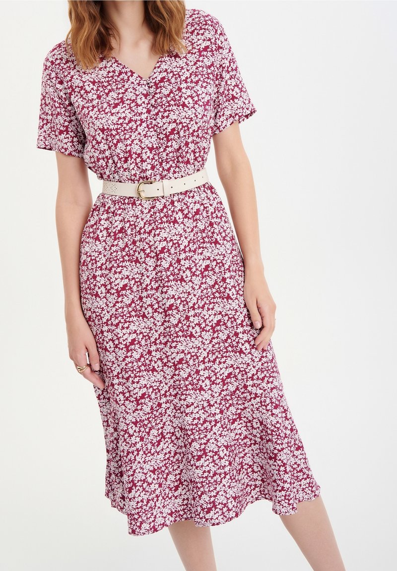 Robe florale bordeaux avec des fleurs blanches, décolleté en V, manches courtes et une ceinture blanche. Mi-longue, en tissu léger, au design fluide.