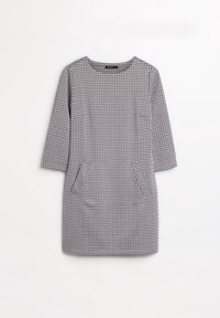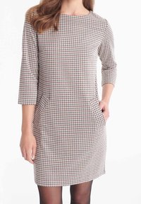 Robe sur mesure à motif à carreaux avec des accents rouges et bleus. Présente des manches trois-quarts et des poches latérales. Confectionnée dans un tissu texturé.