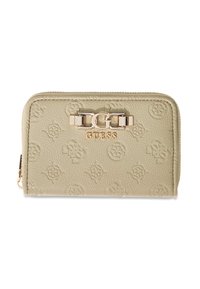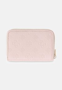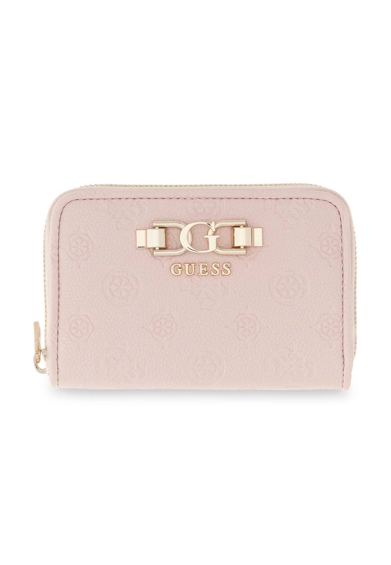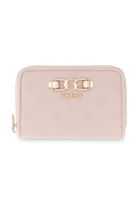 Portefeuille rose blush Guess avec motif logo embossé, logo double G doré et nom Guess sur le devant, fermeture éclair sur le côté.