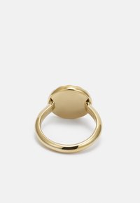 Anneau en ton or avec face ronde, présentant une étoile à huit branches en relief et un petit cristal central, gravé du mot "GUESS" sur le côté.
