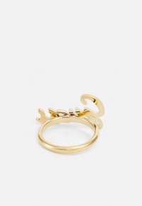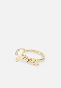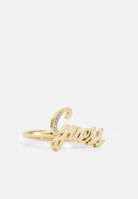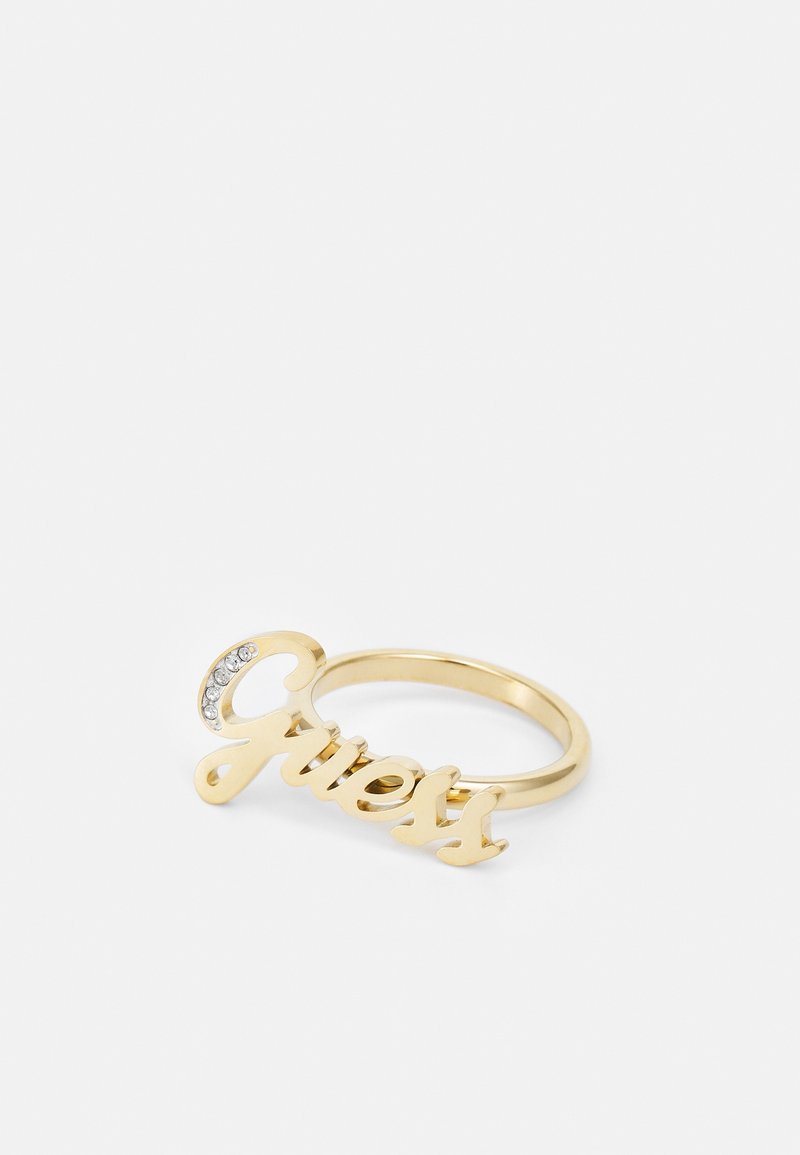 Bague ton or ornée du mot en script "Guess" avec de petits cristaux décorant la lettre "G" sur un fond blanc.