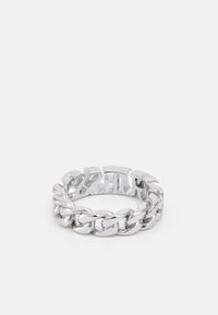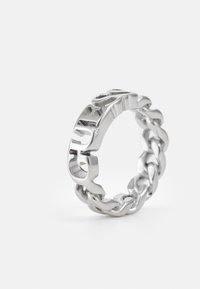 Bague en chaîne argentée avec le mot "GUESS" intégré dans l'anneau, présentée sur un fond blanc uni.