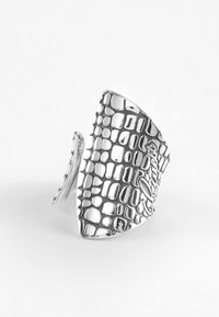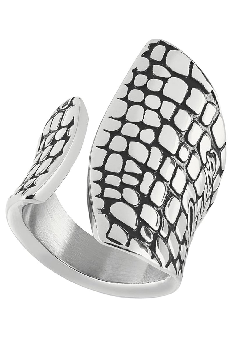 Bague ouverte en argent avec une large bande asymétrique présentant un motif texturé d'écailles de reptile accentué de noir.