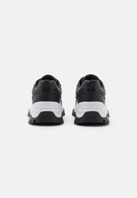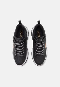 Baskets basses noires avec une semelle blanche épaisse, dessus à motifs, fermeture à lacets et logo triangulaire en or de Guess sur le côté.