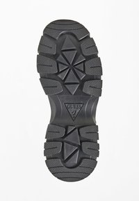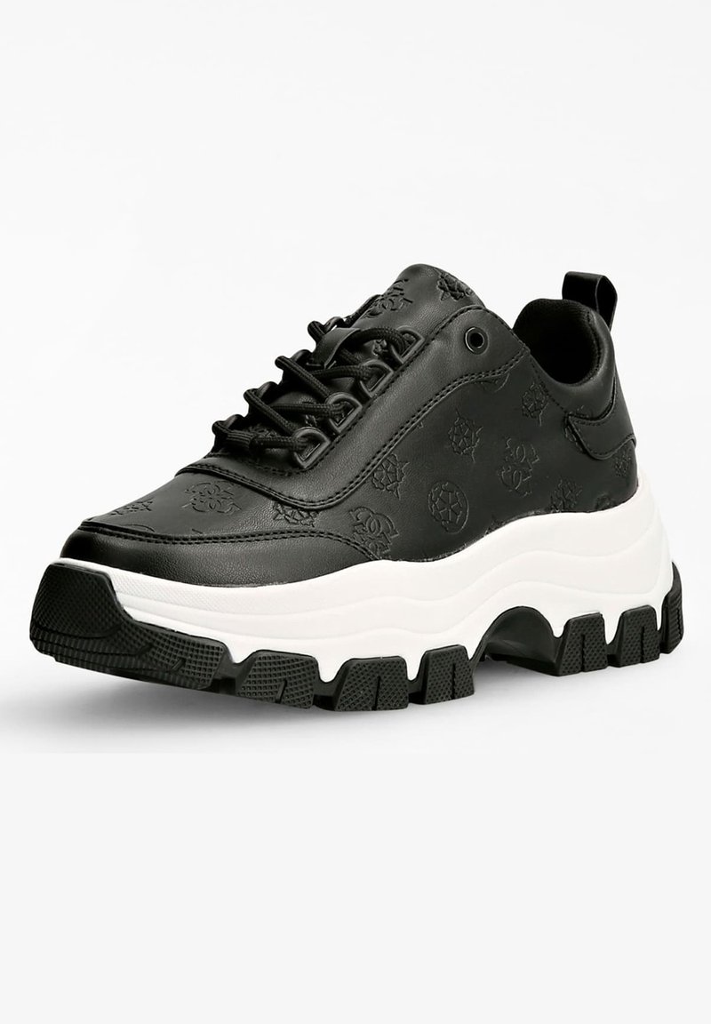 Baskets noires épaisses avec motifs en relief, lacets noirs, semelle blanche épaisse et semelle extérieure noire robuste, vues en angle pour montrer le côté extérieur et l'avant.