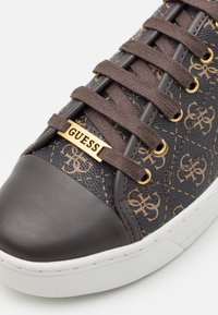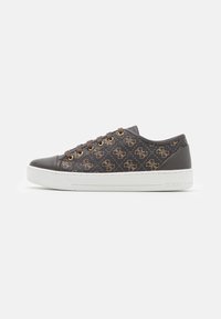Baskets basses marron foncé avec un motif monogramme beige, œillets dorés, lacets marron, semelle blanche, et "GUESS" embossé sur le côté.