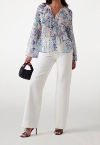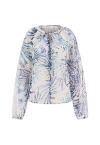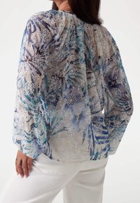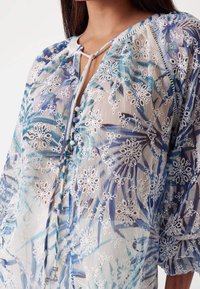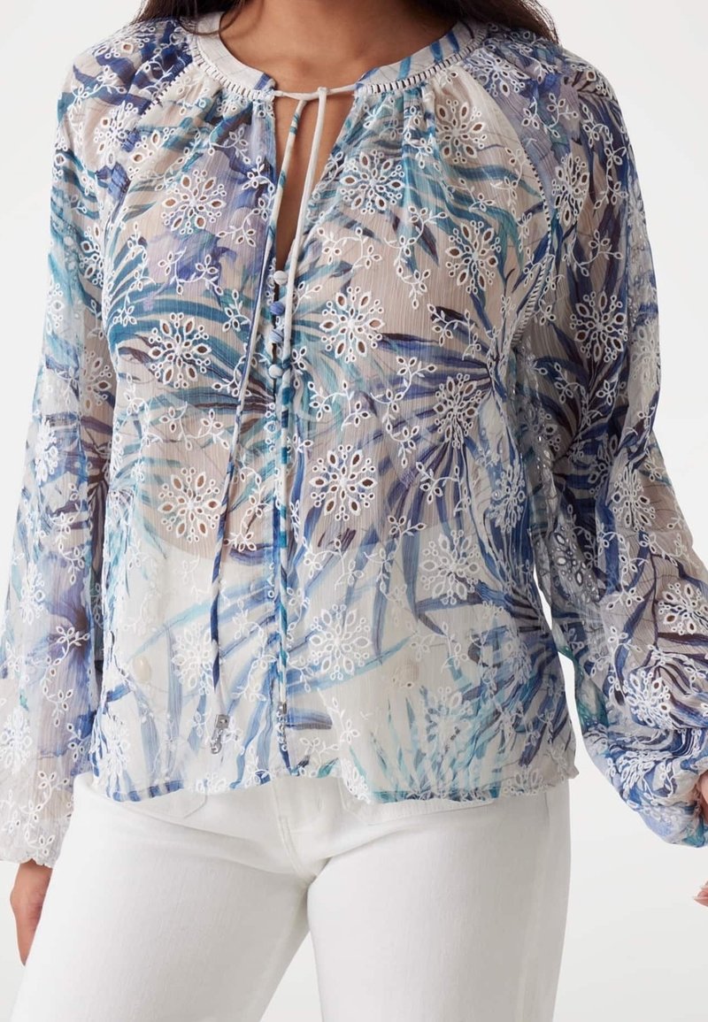 Blouse transparente avec broderie florale en bleu, blanc et crème. Dotée d'une encolure fendue, de manches longues et d'une coupe décontractée.