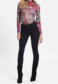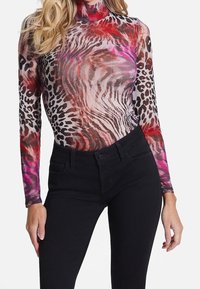 Femme portant un haut à manches longues et ajusté avec des imprimés animaux variés en rouge, rose et marron, associé à un pantalon noir taille haute.