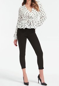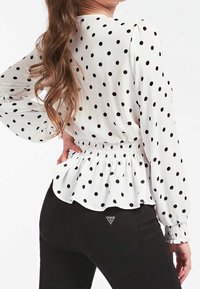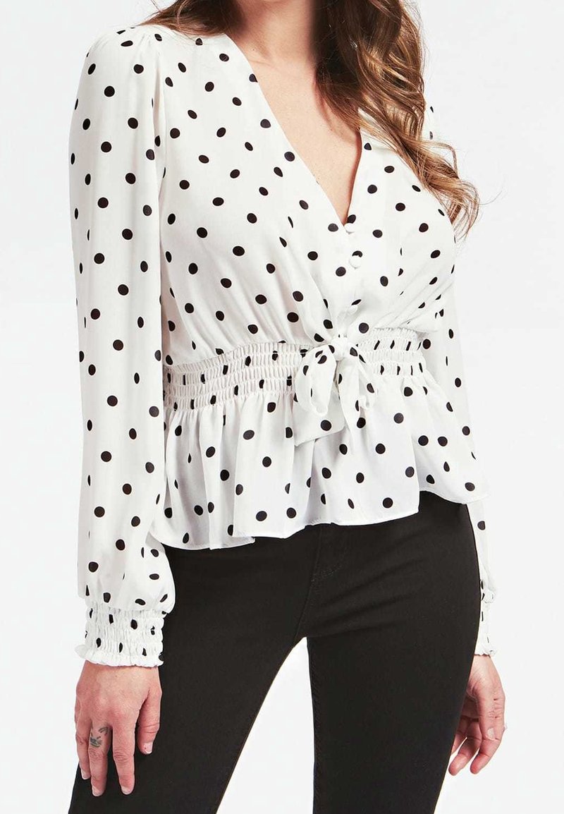 Femme portant un chemisier blanc à manches longues avec des pois noirs, un col en V, un lien à l'avant, une taille froncée, et un pantalon noir.