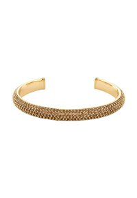 Bracelet manchette ouvert en ton or, incrusté de petites pierres précieuses brunes disposées en motif uniforme le long de la surface extérieure.
