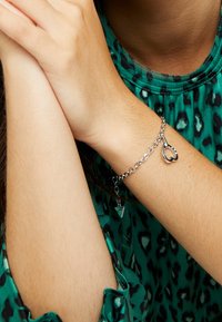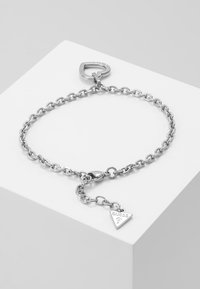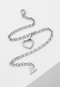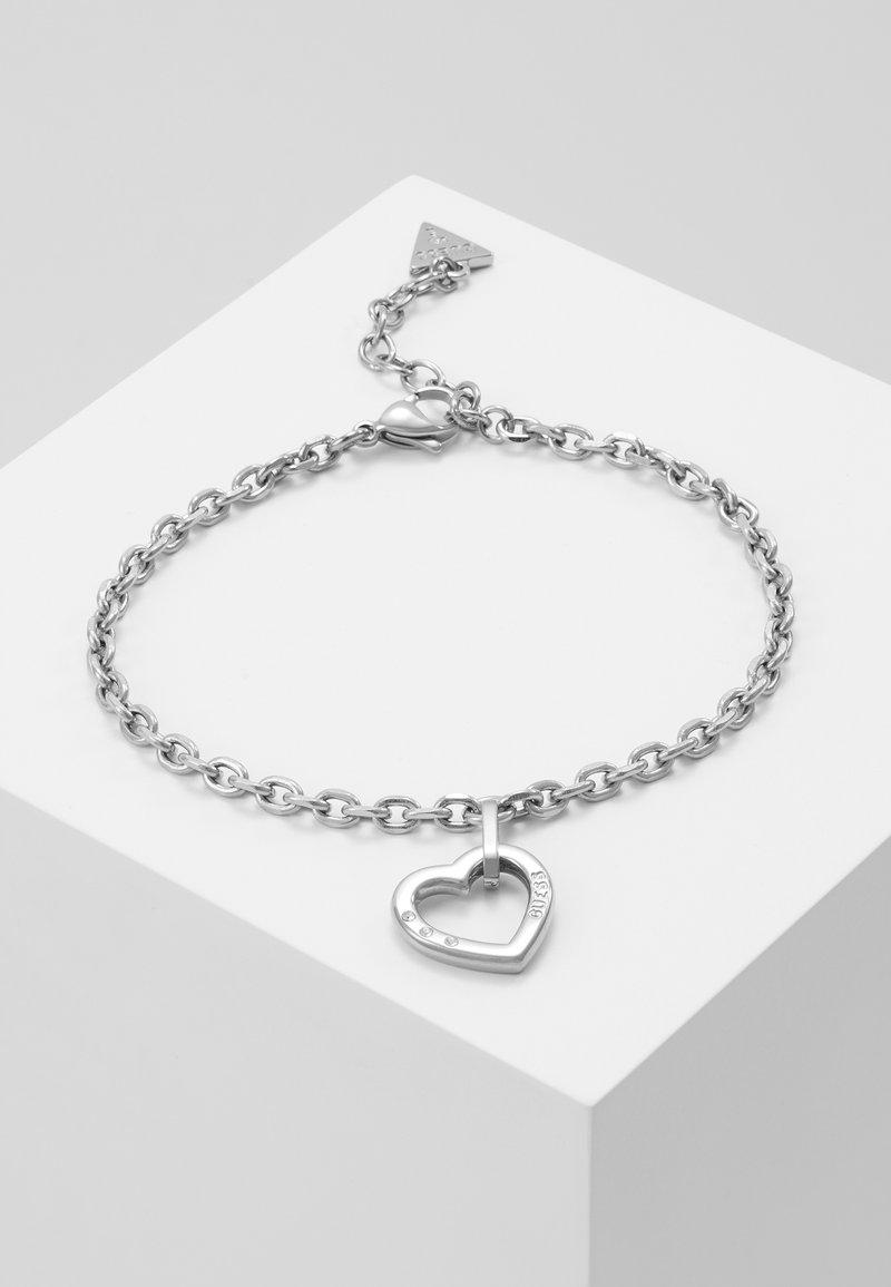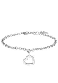 Bracelet en chaîne argentée avec un pendentif en forme de cœur et un fermoir mousqueton, présenté sur une surface géométrique blanche.