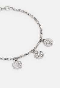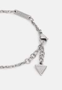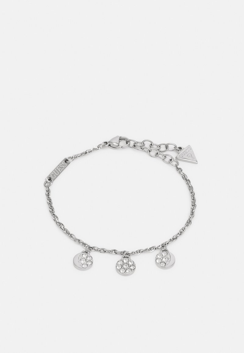 Bracelet chaîne argent avec trois breloques rondes en cristal, un fermoir réglable et une petite breloque logo Guess triangulaire.