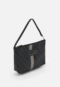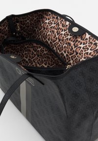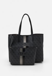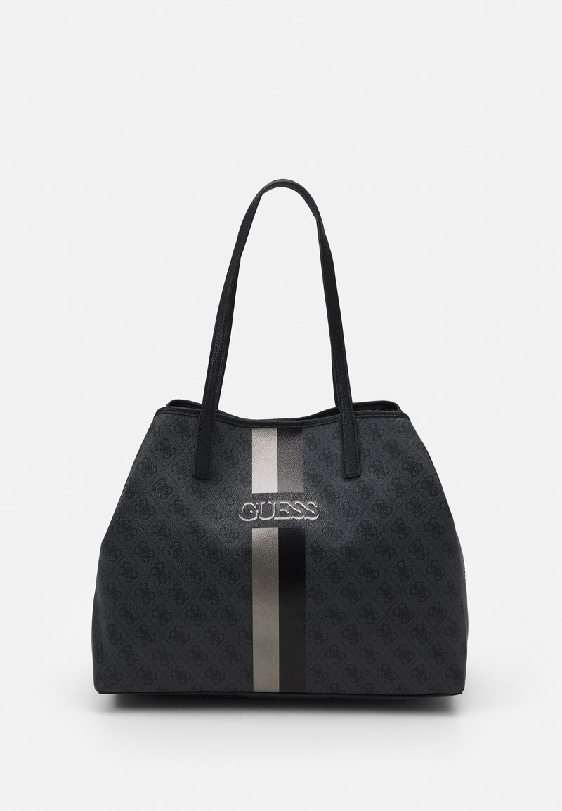 Sac fourre-tout noir de la marque Guess avec un motif de logo imprimé, deux anses, et des rayures verticales beige et noires au centre avant.