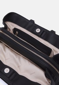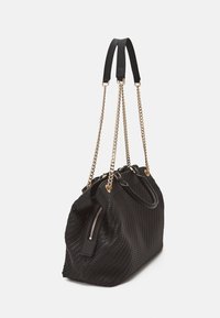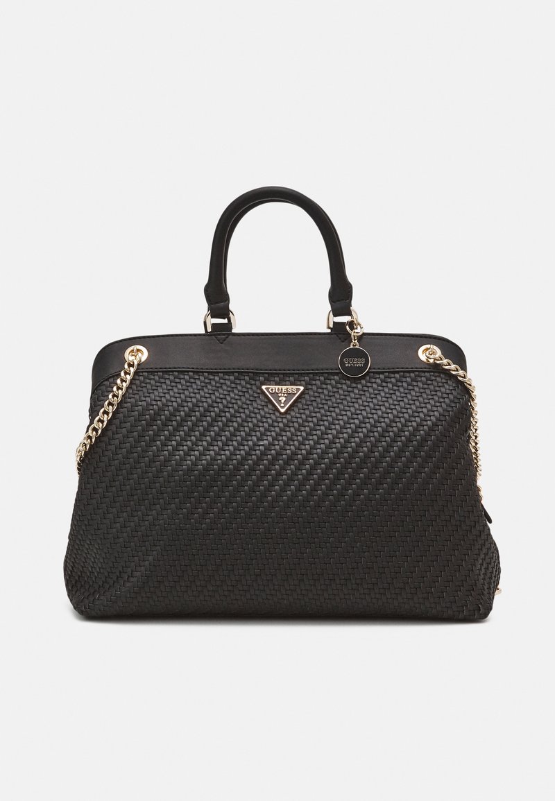 Sac à main noir tissé avec deux poignées, bandoulières en chaîne dorée, et un petit pendentif rond doré de la marque sur un fond uni.