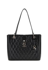 Sac à main matelassé noir de Guess avec double poignées, pendentif logo argenté, et petite décoration de cadenas et clé attachée.