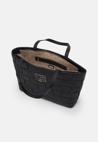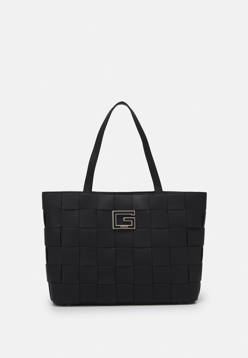 Sac fourre-tout tissé noir avec deux bandoulières et une plaque métallique "G" en logo au centre avant.