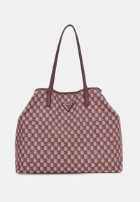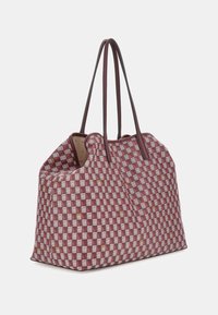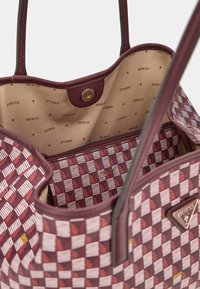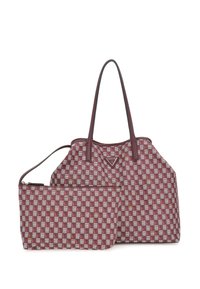 Femme portant une veste et un pantalon beige, tenant un grand sac cabas à carreaux bordeaux et blancs avec deux poignées.