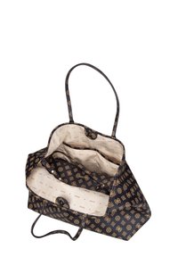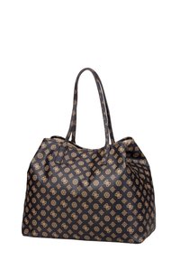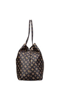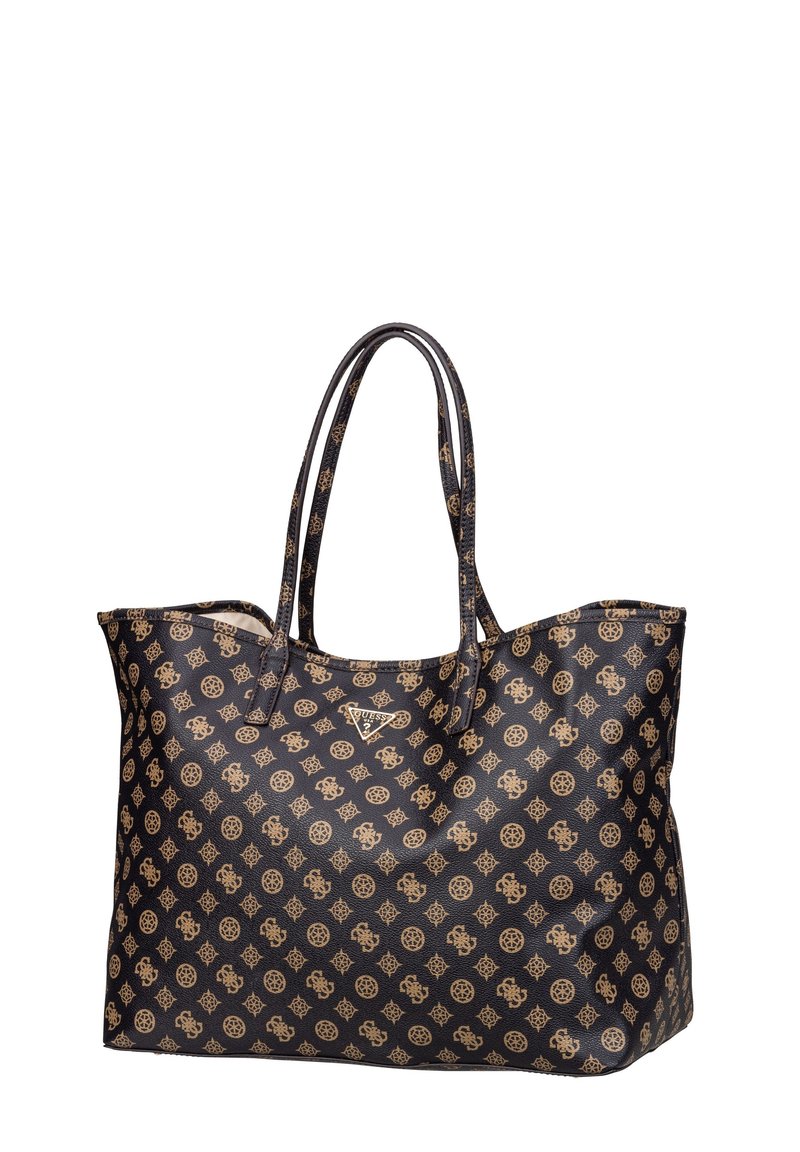 Sac fourre-tout Guess noir et marron à motifs, avec poignées doubles et plaque de logo triangulaire au centre avant.