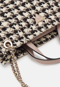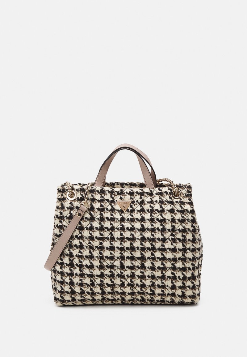 Sac à main à motif pied-de-poule noir et blanc avec des poignées beiges, une bandoulière en chaîne dorée et une petite plaque logo dorée à l'avant.
