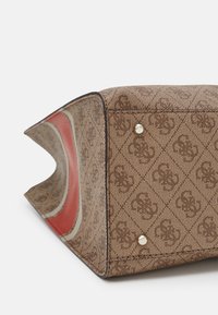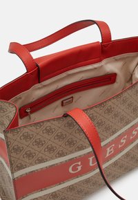 Sac fourre-tout à motif beige et marron avec des poignées rouges et une bande rouge au centre affichant le texte blanc "GUESS".