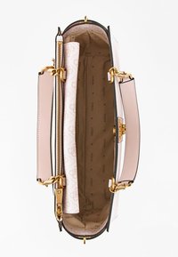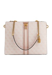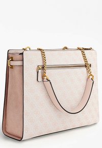 Femme en robe rose clair tenant un grand sac à main beige de designer avec une bandoulière chaîne dorée et un motif logo sur l'épaule.