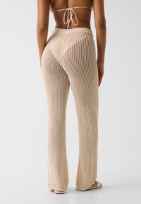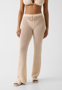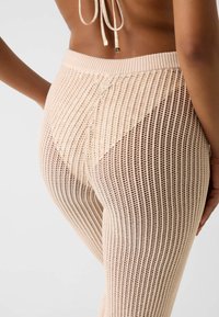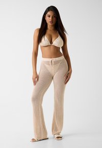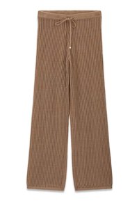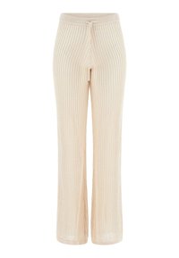 Femme portant un pantalon beige en maille à jambes larges avec une taille à cordon, associé à des sandales blanches à bouts ouverts et à un soutien-gorge clair assorti.
