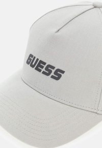 Casquette de baseball gris clair avec visière courbée et logo noir "GUESS" à l'avant, présentée sur un fond blanc.