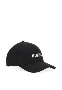 Casquette de baseball noire avec visière incurvée et logo blanc "GUESS" centré sur le panneau avant sur fond blanc.