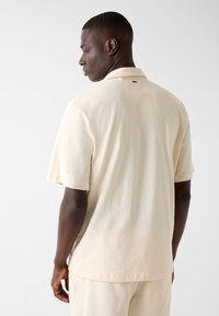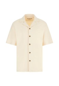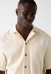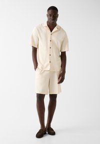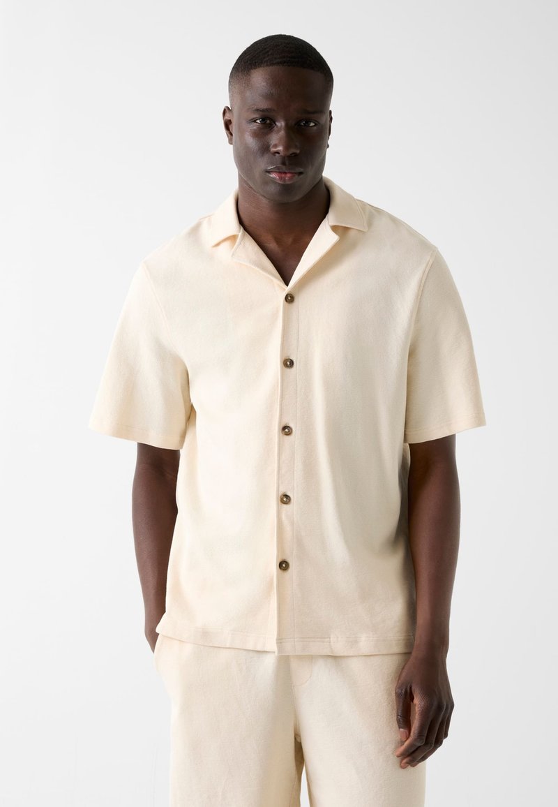 Homme aux cheveux courts portant une chemise crème à manches courtes et un pantalon crème assorti, sur un fond blanc uni.