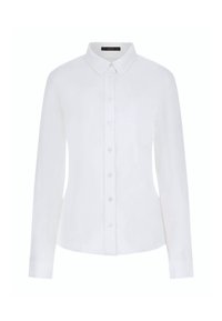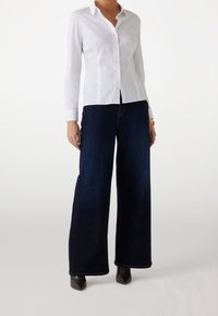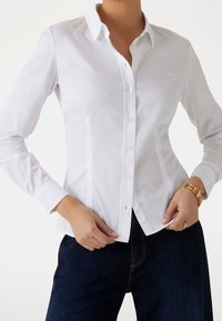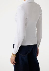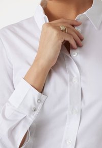 Femme portant une chemise blanche ajustée à boutons avec manches longues et un pantalon bleu foncé, accessoirisée d'une montre en or et d'une bague.