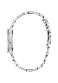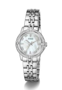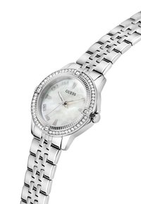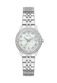 Montre-bracelet Guess métallique argentée avec lunette ornée de cristaux, cadran en nacre et chiffres romains, sur un bracelet à maillons.