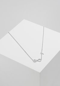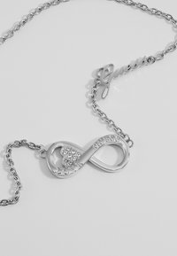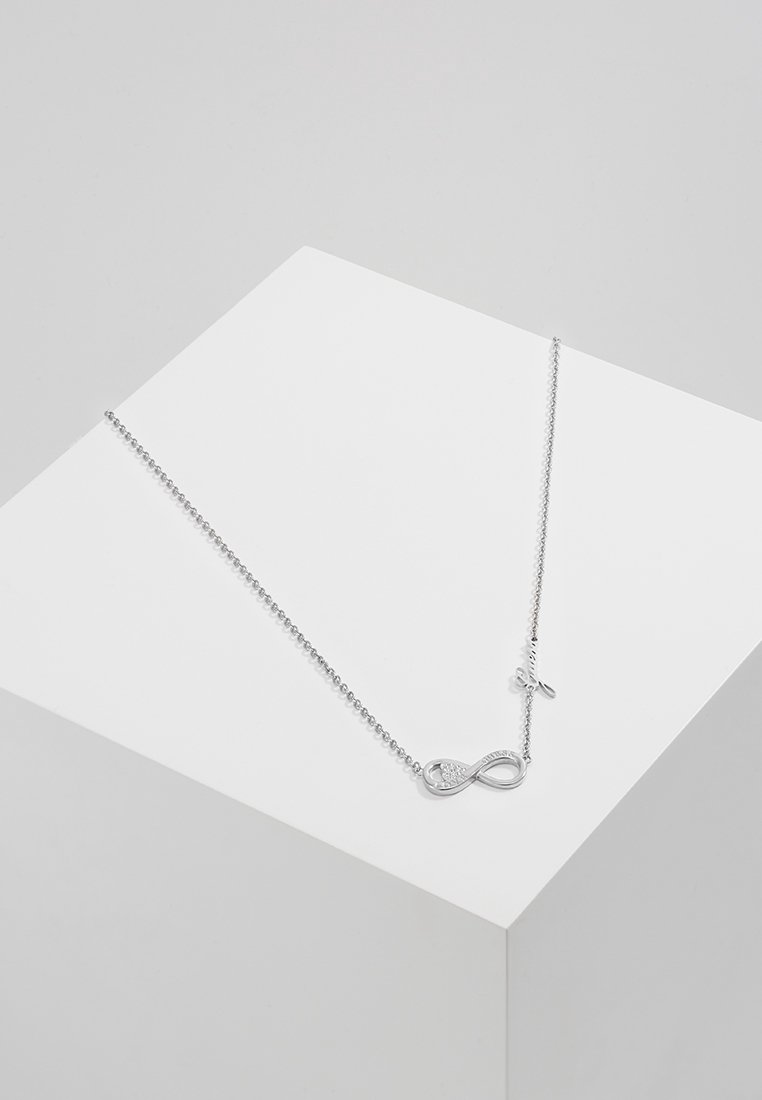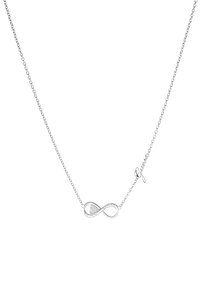 Collier délicat en chaîne argentée avec un pendentif symbole de l'infini orné de petits cristaux incrustés sur une surface blanche minimaliste.