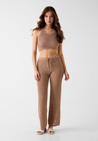 Femme aux longs cheveux ondulés portant un crop top beige en maille et un pantalon taille haute assorti sur un fond clair uni.