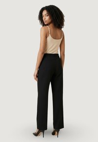 Femme aux cheveux bouclés portant un caraco beige Guess et un pantalon noir taille haute, debout devant un fond clair uni.