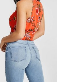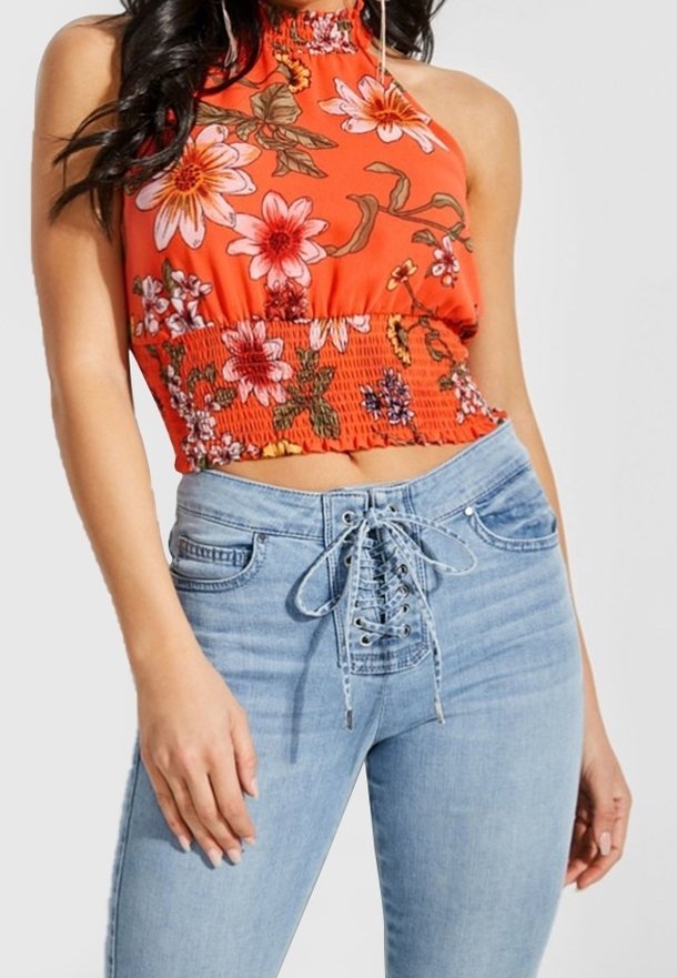 Femme portant un haut court sans manches à fleurs orange et un jean taille haute bleu clair avec un détail de laçage à l'avant.