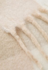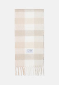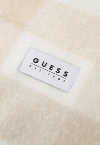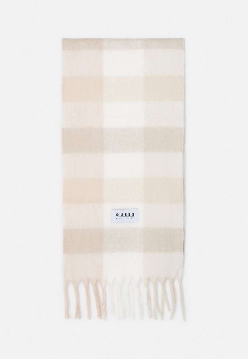 Écharpe à carreaux beige et blanc avec des extrémités à franges et une étiquette rectangulaire blanche de la marque GUESS au centre.