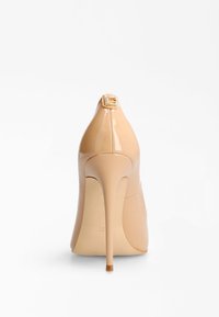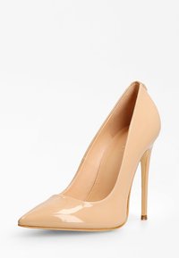 Pompe à talon aiguille en cuir laqué nude avec un bout pointu et une silhouette élégante. Présente un talon stiletto fin et une finition lisse.