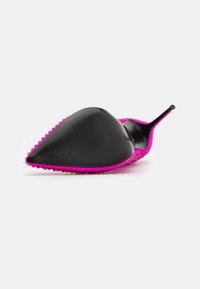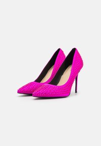 Talons aiguilles rose vif, à bout pointu, recouverts de petites rivets ronds espacés de manière uniforme sur un fond blanc uni.